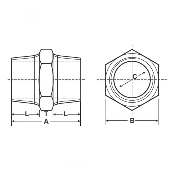 | Nominal Bore | Minimum Length of Thread for Basic Gurge Length + Dia Clearance (L) | Thickness of Hexagon (T) | Minimum Overall Length (A) | Minimum Diameter of Bore (C) | Width Across Flat of Hexagon (B) |
