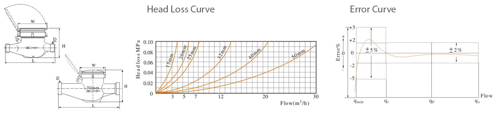 | Nominal Size DN (mm) | Class of measurement | Maximum Flow Rate (m³/h) | Nominal Flow Rate (m³/h) | Transiional flow-rate (L/hr) | Minimum flow-rate (L/hr) | Maximum Reading (m³) |