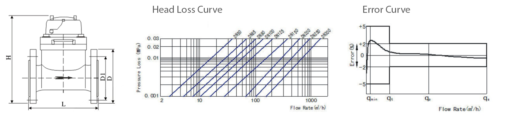 | Size (mm) | Overload flow-rate Qs (m³/h) | Permanent flow-rate Qp (m³/h) | Transiional flow-rate Qt (l/h) | Minimum flow-rate Qmin (l/h) | Minimum Reading Min (m³) | Minimum Reading Max (m³) |